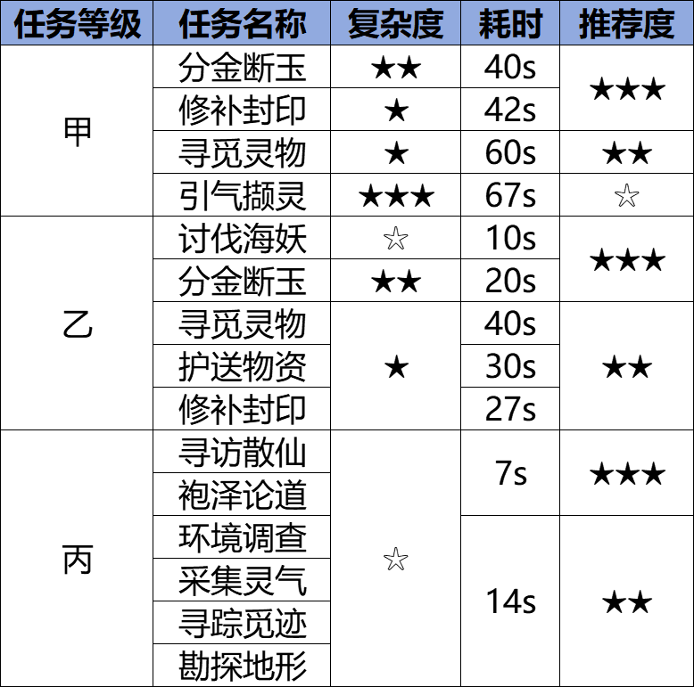 甲级推荐分金断玉、修补封印,乙级推荐讨伐海妖、分金断玉,丙级推荐寻访散仙、袍泽论道。具体推荐如下表所示,各个任务详细的攻略指引可以看第三部分。