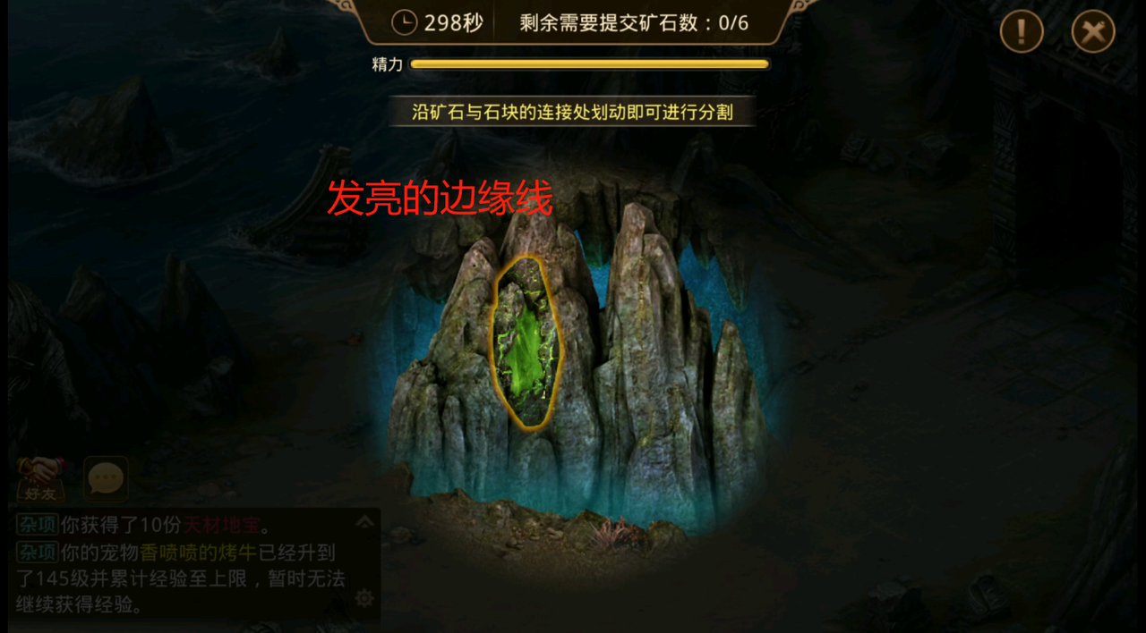 五派弟子开采了些许原石,快助其将矿石分镏出来吧!该任务需要根据发亮的边缘线提示,确认石块的位置,然后沿石块边缘用手指进行滑动,将石块分割出来即可完成,大家用手把压着线的石块涂抹一下就行了。甲级乙级均有,甲级要求分割6块,乙级要求分割3块。