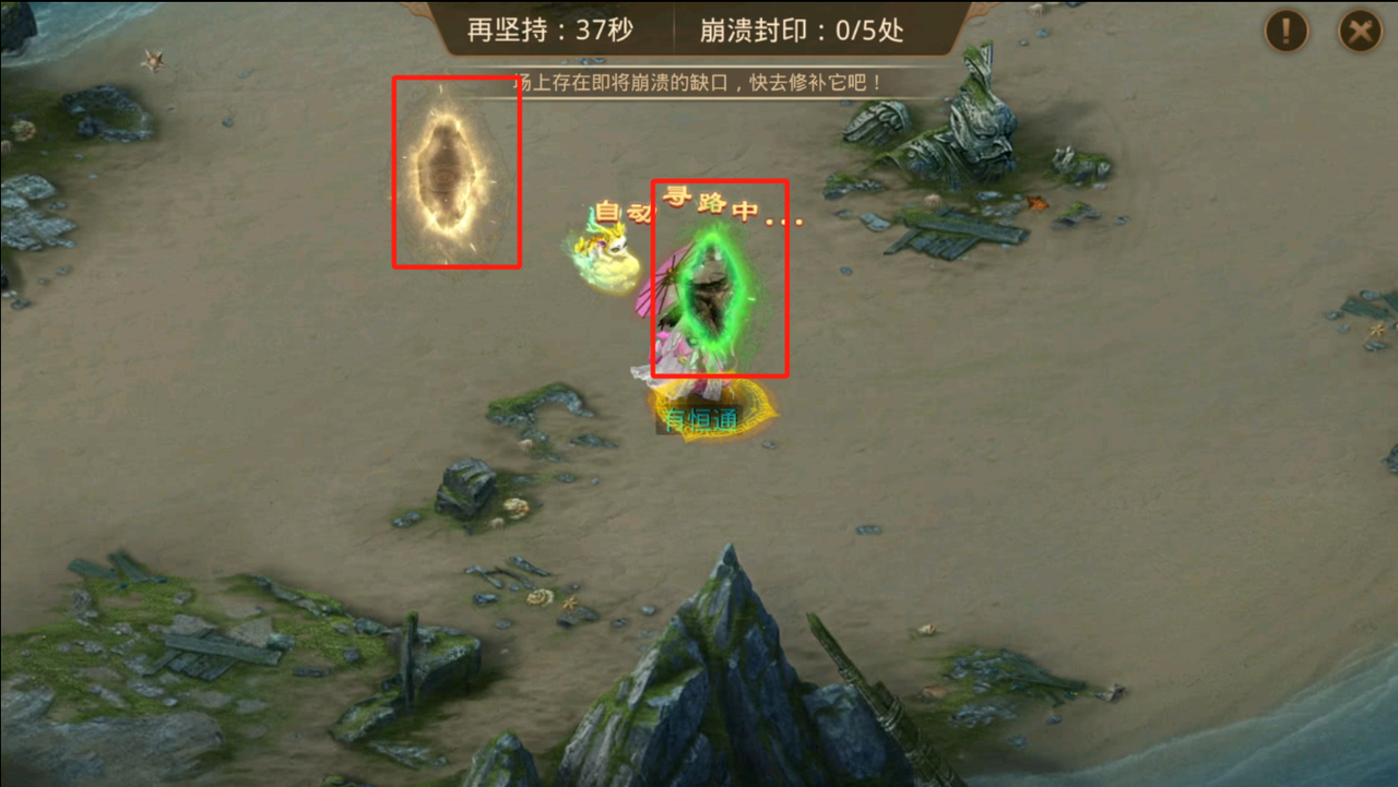 老君发觉有一处封印出现了缺口,快去将其修补吧!该任务比较简单,哪里亮了点哪里即可修复缺口,指定时间内只要不漏5次缺口即可完成。随着时间推移后续缺口会出现的越来越多,一个缺口大概持续8s左右,大家前期尽量不要漏,后面即使漏几个也没关系,把握好的话后面几秒的时间不操作也是可以的。甲级乙级均有,甲级要求坚持42s,乙级要求坚持27s。