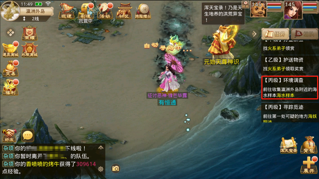 帮助太上老君收集一些瀛洲地域上的样本。右侧任务栏点击该任务,会自动寻路分别采集海水、土壤和植物样本,采集完成即可完成任务。