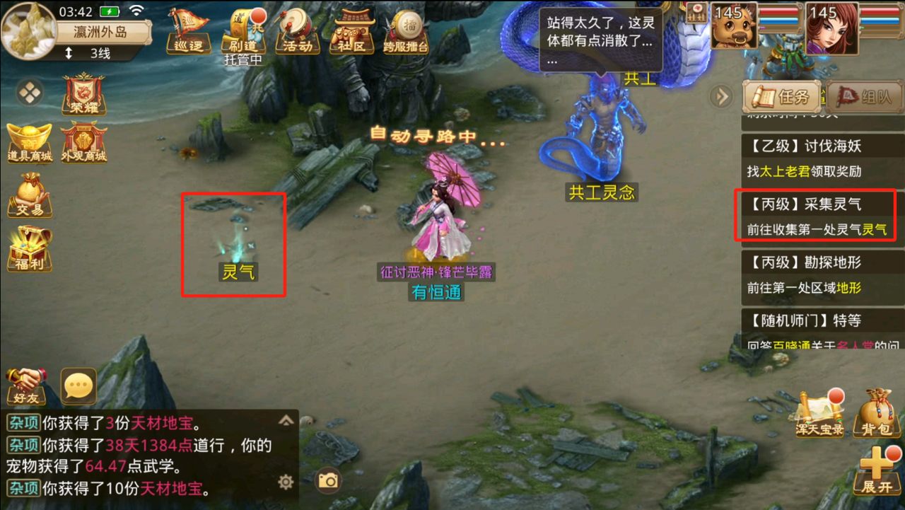 前往瀛洲外岛帮助太上老君收集三处灵气。右侧任务栏点击该任务,会自动寻路寻找三处地图上的3处灵气,采集完成之后即可完成任务。