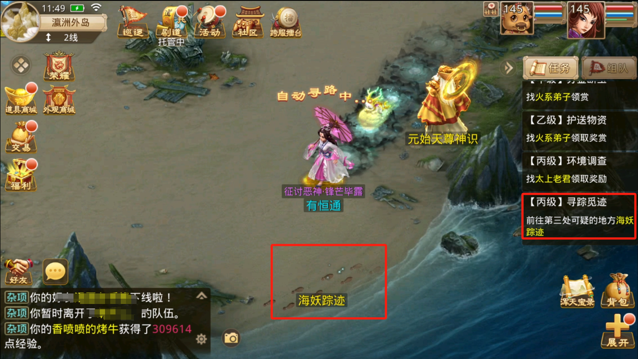 近期似乎有海妖在瀛洲频繁活动,去调查一番吧!右侧任务栏点击该任务,会自动寻路寻找三处地图上的3处海妖踪迹,寻找完成之后即可完成任务。15s