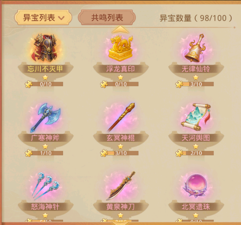 其中,除去下品的20件异宝,剩余的80件组成共12种共鸣组合,收集到对应的异宝就可以激活共鸣属性,集齐下品以上的80件异宝,即可激活全部共鸣属性。共鸣属性激活后会提升对应属性。