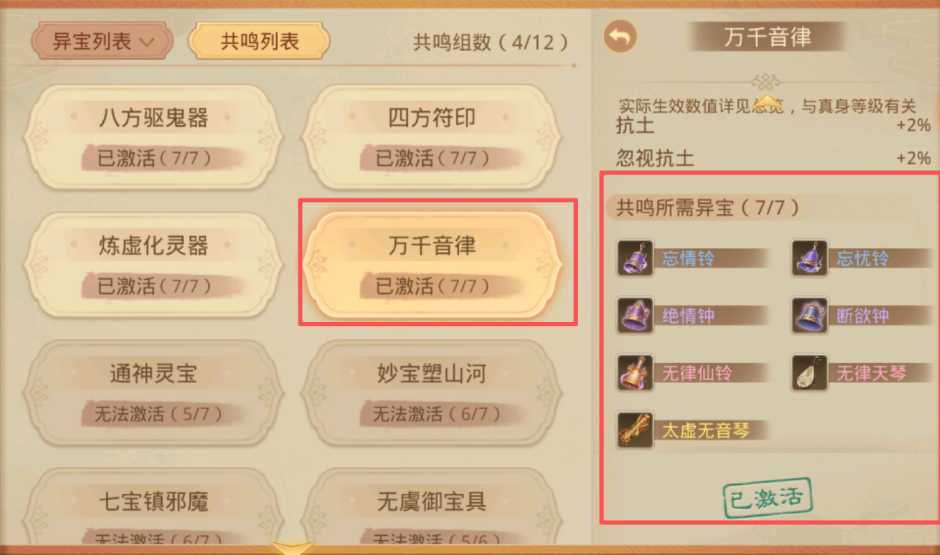 如下图中的《万千音律》,拥有右边7种异宝即可激活该共鸣属性。
