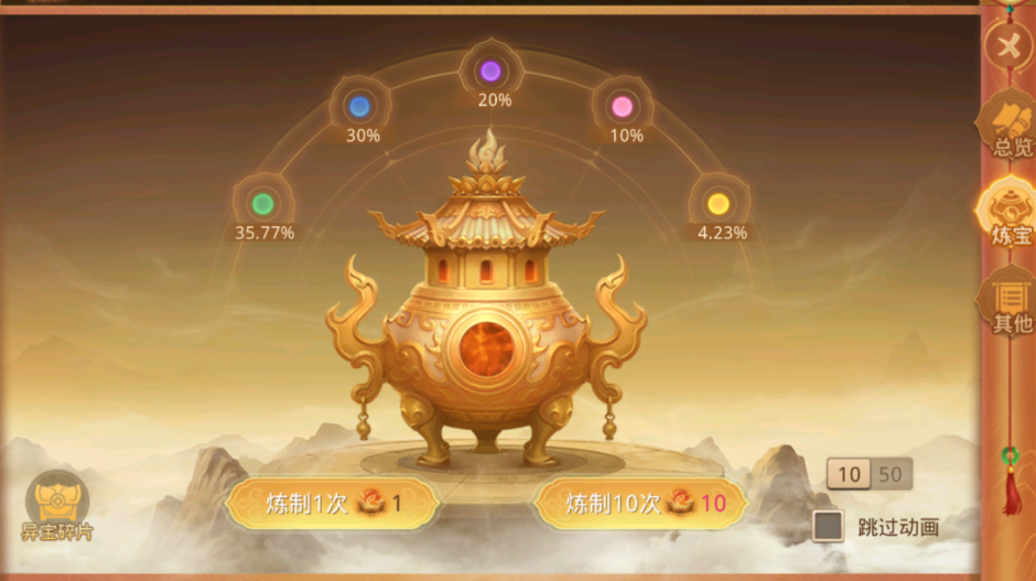 异宝的获取方式需要在炼器鼎中消耗天材地宝炼制(抽取),每1个天材地宝随机炼制出1件异宝。