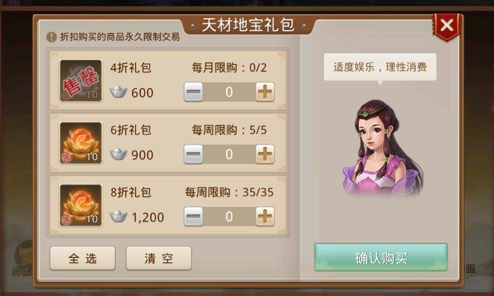 6折礼包,每周限购5个,花4500元宝买50个天材地宝,每周省3000元宝,每月省12000元宝。