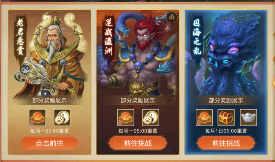⑥:囚海之乱,组队月BOSS,有1-7成难度,5成开始有首胜、次胜奖励,难度越高,获得天材地宝的数量越多。