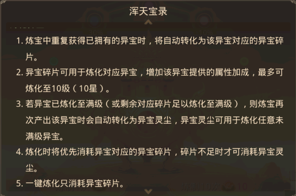 抽到重复异宝时,将自动转化为该异宝对应的异宝碎片,每10个碎片可以给该异宝炼化(升星),最多可以炼化到10星。